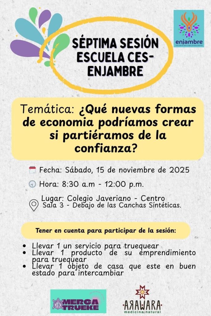 🌱¡¡¡Avanzamos en nuestra escuela CES Enjambre!!!💜 En la séptima sesión reflexionaremos sobre las nuevas formas de entender y hacer economía, bajo principios de confianza, solidaridad, reciprocidad y cuidado de la vida.