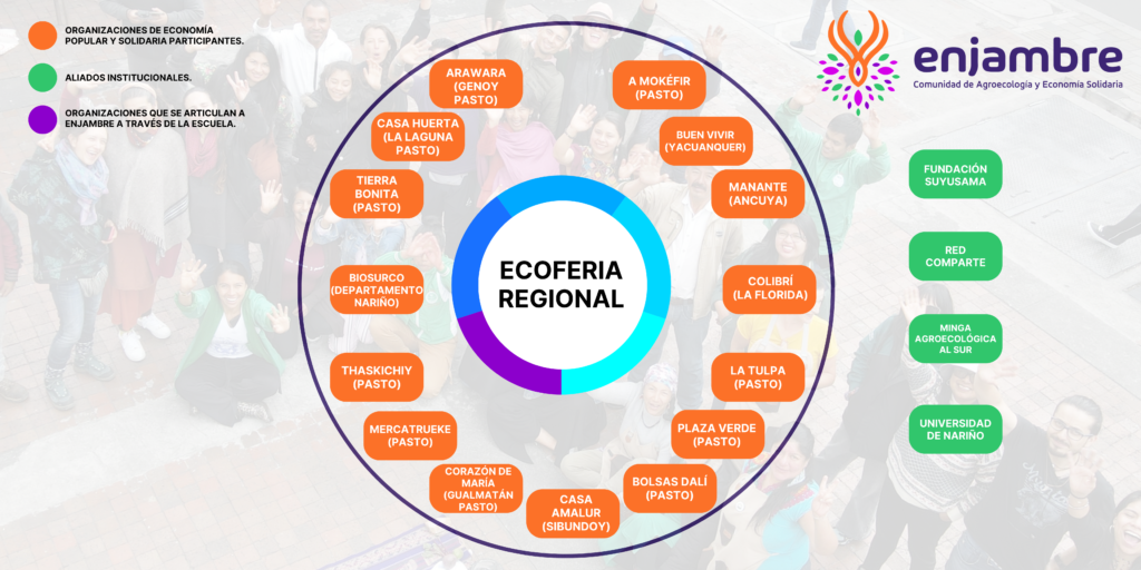 «Enjambre – Comunidad de agroecología y economía solidaria» es una plataforma colaborativa que articula organizaciones de economía popular y solidaria, la academia y ONGs, para el desarrollo de iniciativas de formación, investigación, gestión e incidencia en el sur occidente colombiano, hoy somos 13 organizaciones, más de 150 familias, en 6 municipios del departamento de Nariño y Putumayo, con procesos de transición agroecológica, que nos unimos en una juntanza por la vida, nuestro CES Enjambre y la Ecoferia Regional es el espacio de encuentro en el que todas las personas son bienvenidas.